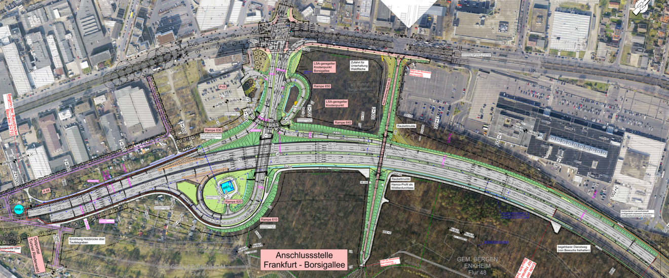 Mit Fertigstellung der Anbindung der A66 an die A661 wird östlich des Riederwaldtunnels die neue Anschlussstelle Borsigallee entstehen.
